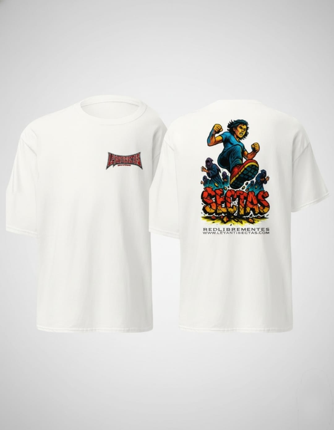 2️⃣ Elige tu estampado para la espalda: Escoge el diseño que grita tu causa al mundo. Desliza para ver las opciones dentro de la tienda de LeyAntiSectas👉: