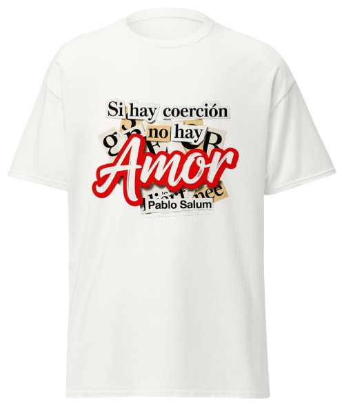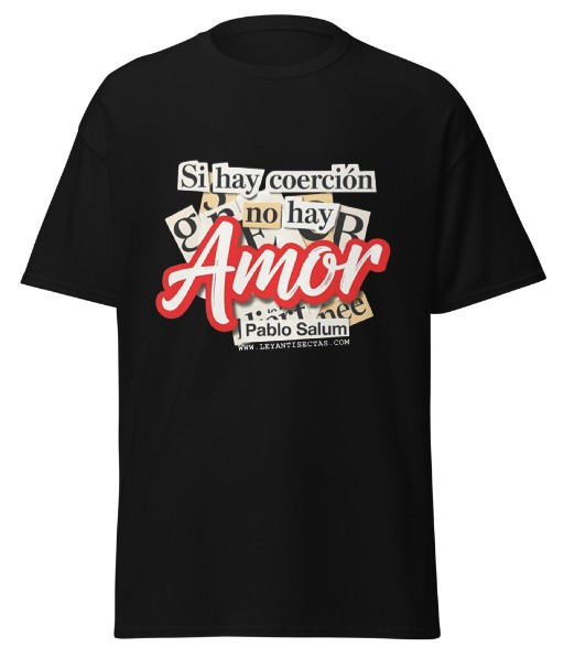 Esta camiseta es más que una prenda; es un manifiesto. El diseño «Si hay coerción, no hay Amor» de LeyAntiSectas y Pablo Salum es una declaración de principios sobre la verdadera naturaleza de los afectos. Utilizando una tipografía que simula recortes de revista, el diseño evoca la manipulación y la ruptura que genera el control coercitivo, contrastando con la palabra «Amor», que se alza limpia y poderosa en el centro.